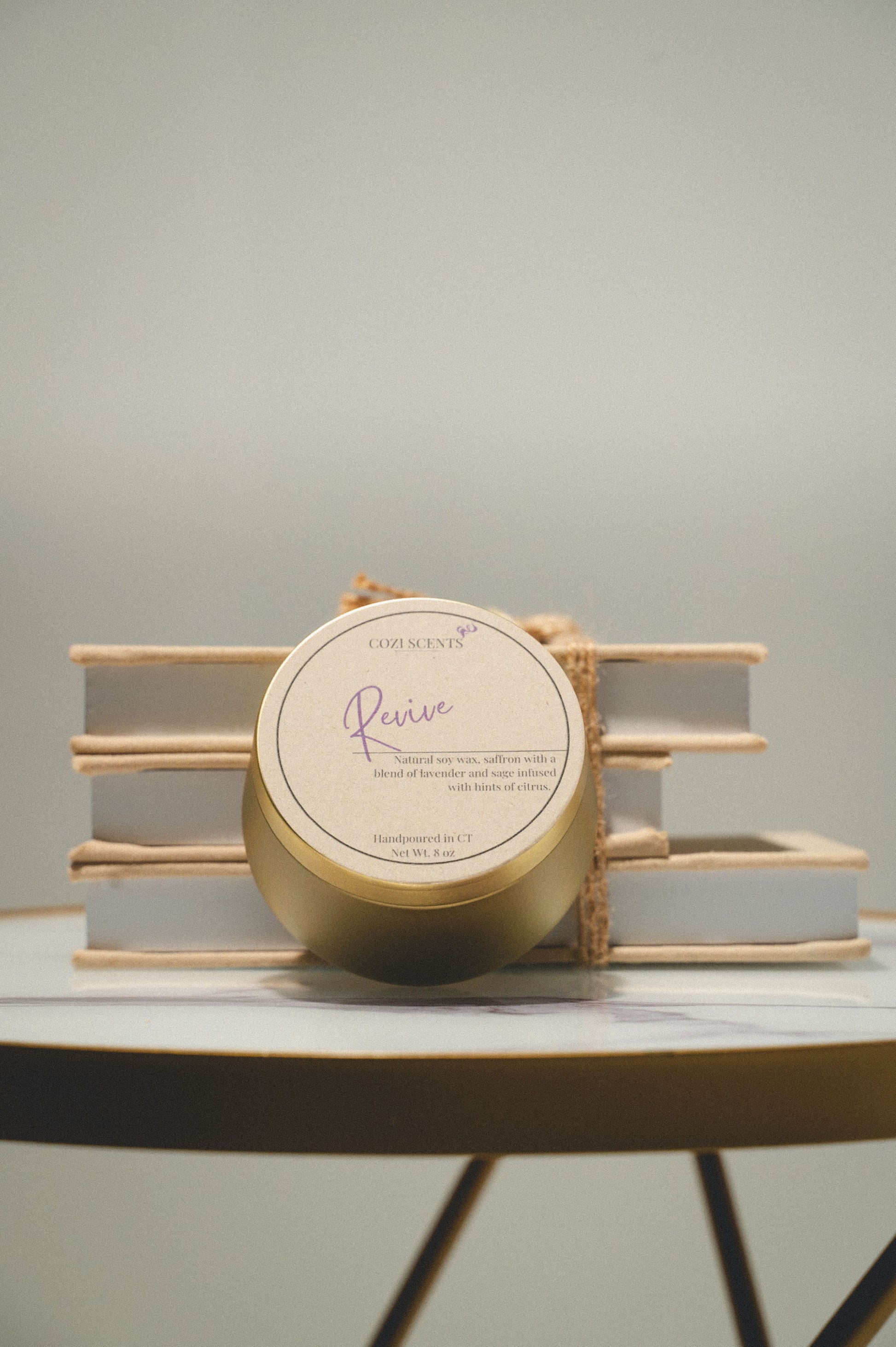 Refresh your spirit and awaken your senses with Revive, a candle designed to bring balance, clarity, and renewal. Made with 100% natural soy wax, this luxurious blend of soothing lavender, cleansing sage, and exotic saffron creates the perfect atmosphere for relaxation and rejuvenation.